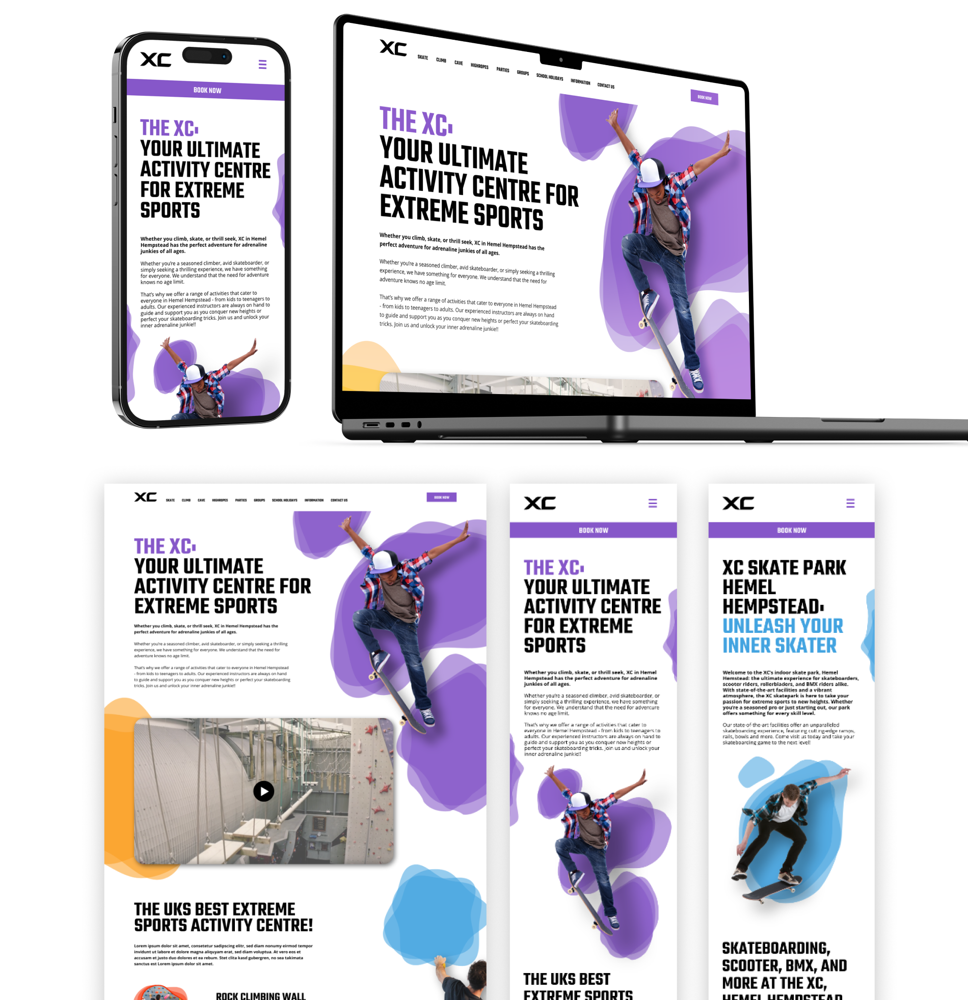 The XC centre is a large indoor extreme sports complex with their primary selling force being their climbing wall, which developed the concepts for the graphic device which holds the imagery throughout the website, the shapes of climbing wall handles work as moving backgrounds to images and devices to contain them.